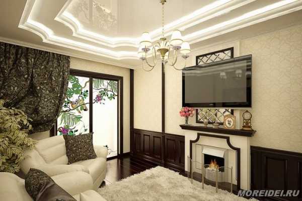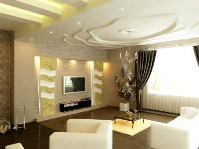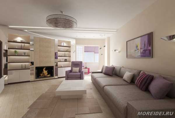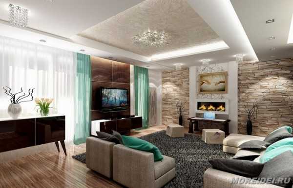 - Отдельного внимания заслуживает свет в гостиной – лучше всего, если это будет подвесной (гипсокартонный, натяжной) потолок со встроенными светильниками или многоуровневая конструкция. Она позволит точечно выделять светом разные зоны и создавать особую атмосферу
