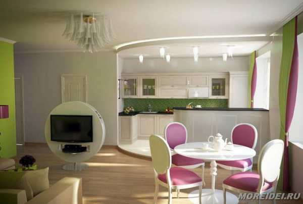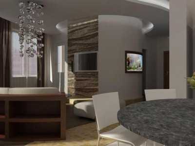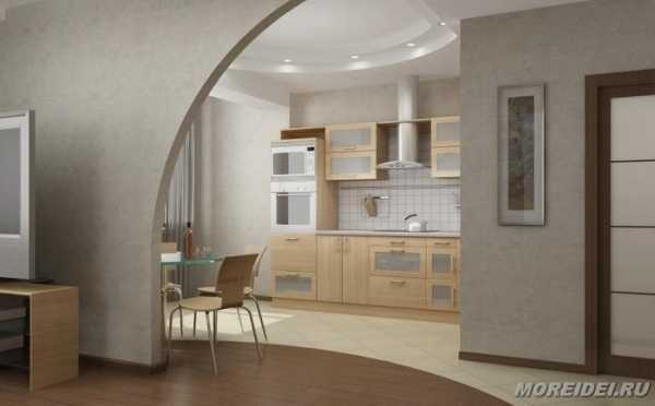 - Обитая в трехкомнатной квартире, очень часто соединяют гостиную с кухней, чтобы получить одну комнату-столовую. Идея эта хорошая, но здесь важно правильно отделить кухню от столовой (гостиной, зала). Сделать это можно при помощи простых приемов – установить легкие перегородки-ширмы из-за которых кухня будет как будто «выглядывать», арки или колонны. Таким образом, гостиную можно разделить не только на две, но и на несколько (три-четыре) зон. Например, арка соединит общее пространство, а дополнительная ширма или колонны отделят обеденную зону от зоны релакса, где будет стоять диван, телевизор, висеть полочки с книгами