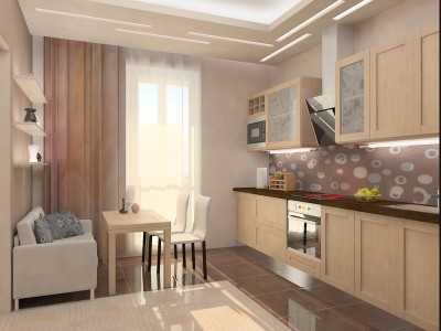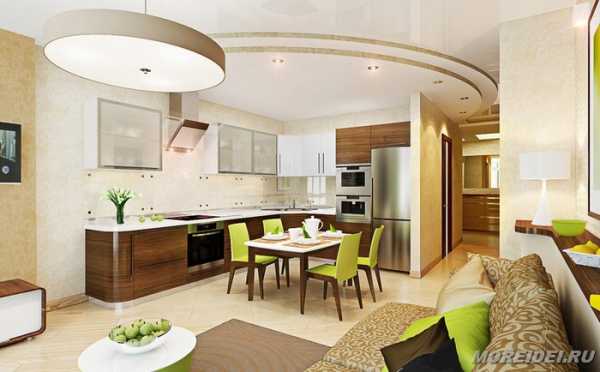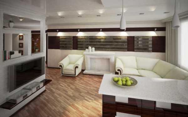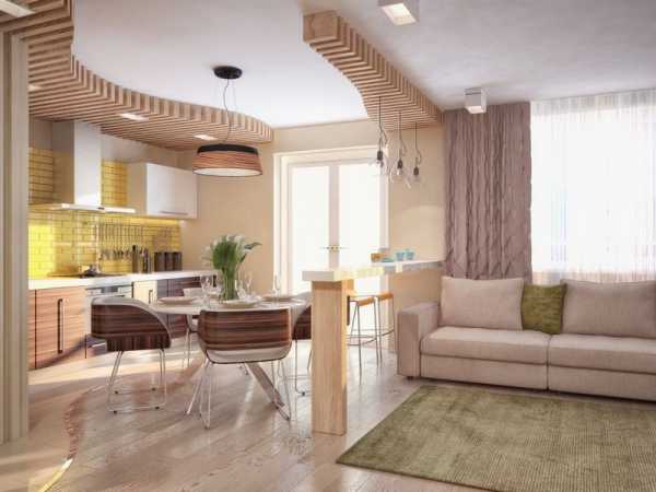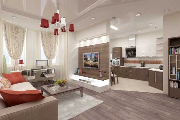 - Популярным решением дизайна двухкомнатной квартиры является совмещение кухни – тогда получается одно просторное помещение. Но и его стоит, хоть и условно, но разделить на зоны. Кухню можно оформить в коричневых, вишневых, темно-синих тонах, а соседнюю зону – в контрастных. Например, для «вишневой» кухни подойдет гостиная в бежевом или белом цвете, а для «синей» — комната в кремовых, алых или бледно-желтых цветах. Объединяющим элементом кухни и гостиной могут стать мелкие предметы интерьера – чехлы для стульев и дивана одного цвета, картины в одинаковых рамках