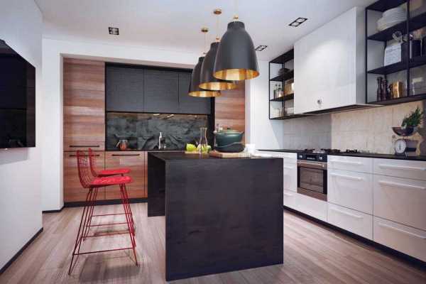Один из главных пунктов – освещение. Кроме основного источника света обязательно наличие дополнительных точечных светильников, выделяющих отдельные зоны кухни.