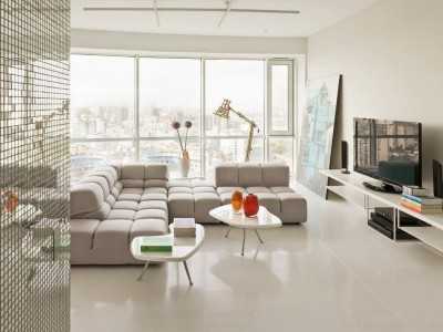 Дизайн гостиной опирается на простор, который достигается благодаря светлым оттенкам в интерьере и простой многофункциональной мебели.