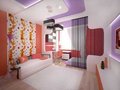 - Детская может стать ярким акцентом всей квартиры – ее можно оформить в пестром цвете. Например, в лиловом, фиолетовом или нежно-сиреневом – такие цвета подойдут для ребенка любого возраста и пола. В детской главное – решить проблему со всякими нужными ребенку мелочами. Здесь должно быть побольше удобных ящиков, комодов, открытых полок. Внести «детское настроение» можно при помощи коврика, яркой оббивки дивана или кресел. Например, используя лиловый как основной цвет, коврик стоит подобрать голубого, желтого или зеленого цвета