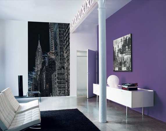 Обои фиолетового цвета для зала относится к темным оттенкам, поэтому хорошо смотрится в больших комнатах. Но оклеивать небольшие по размерам комнаты тоже можно, так как феномен этого цвета в том, что он зрительно может, как увеличивать, так и уменьшать стены.
