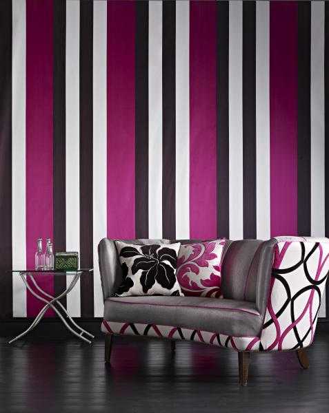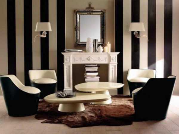 Яркие полосы сделают зал веселым и игривым, но если использовать классические сочетания, тогда наоборот, полосы создадут ощущение строгости.