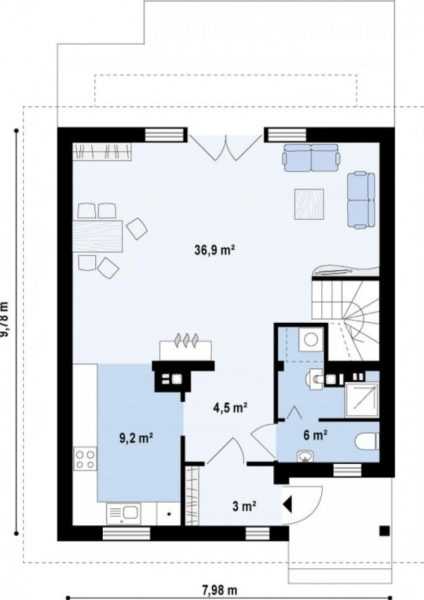 При планировке дома 6 на 6 с мансардой важно использовать все пространство с максимальной пользой. Традиционно по центру располагают просторную гостиную, имеющую выход в санузел и кухню. Все эти комнаты полностью займут первый этаж. Чтобы не было тесно, подбирают компактную мебель.