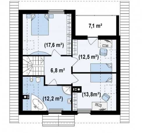 Планировка мансарды использует поверхность крыши и фронтона для формирования стен и потолка. Мансарда увеличивает жилую площадь дома на 50%. Бесполезный объем чердака одноэтажного дома становится полезным, в результате снижается стоимость строительства одного кв.м. В низких местах под скатами легко размещается невысокая мебель: кровати, комоды или тумбочки. На планировке мансарды в наших чертежах указано расположение мебели под скатом крыши. Вы можете построить одноэтажный дом, а когда будет нужно утеплите крышу, сделайте лестницу, поставьте стены и мансарда готова. Это значительно дешевле, чем делать пристройку к дому. Можно добавить слуховые окна, чтобы вставить простое, а не мансардное окно. Тепло поднимается наверх, поэтому в каркасном доме, мансарду можно не отапливать. Не делайте потолок на мансарде, а лучше тщательно изолируйте скаты крыши, чтобы крыша не нагревалась. Любая течь в крыше сразу становится заметна. Можно сразу сделать ремонт, не ожидайте, когда пойдет плесень. Проекты каркасных домов с мансардой строить легко, так как крыша соединяется со стенами в единую конструкцию.
