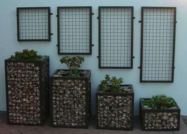 Применяя мелкоячеистую сетку и обычную гальку, создают отличные ступени, бордюры и дорожки. А вазоны из габионов – это естественное и современное украшение любого садового участка.