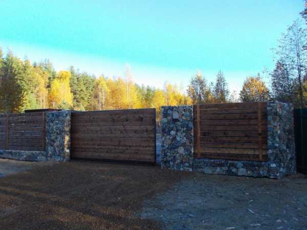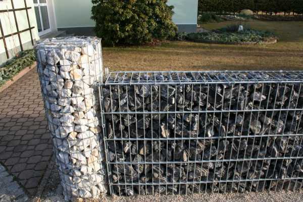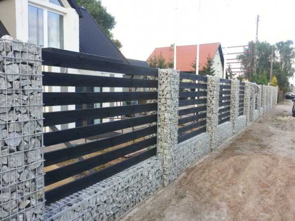 Последующий ход работы заключается в наполнении габионов. Выбирая камень для габионов, из которых строится забор, следует учесть прочность, морозостойкость и, конечно же, внешний вид материала.