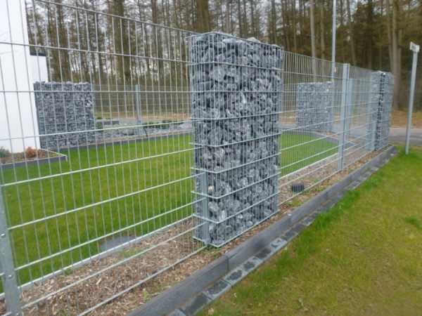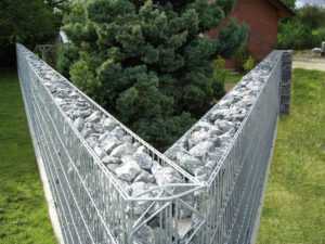 Сеточные конструкции соединяются со столбами с помощью цинковых креплений и скоб для стяжки. Металлическую сетку следует вскрыть специальным раствором, который предотвращает образование коррозии. Забор из габионов – это долговечная композиция, которая по силу простому хозяину, не имеющему особых навыков.