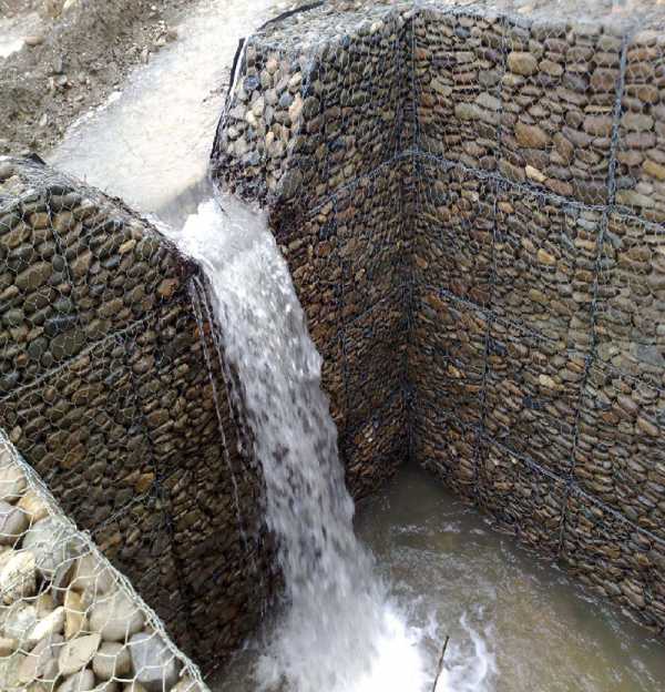 Соединение нескольких сооружений с помощью оцинкованной проволоки превращают их в цельную конструкцию, обладающую высокой водопроницаемостью, так как камни внутри не фиксируются между собой. Отличные дренажные свойства допускают строительство подпорных стенок.