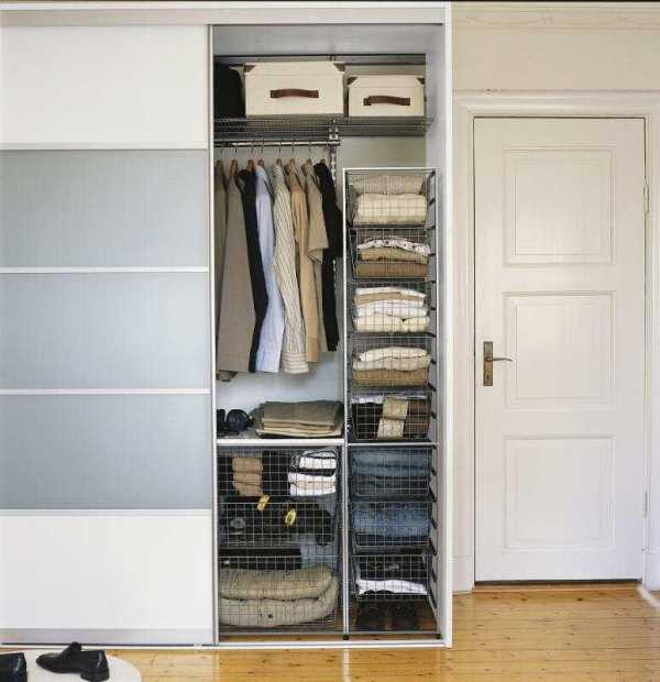 Что же касается дверей, то они могут быть сделаны из специального стекла, благодаря чему всегда будет видно, что за ним находится. «Сотовые» корзины стоит делать из пластика. А держатели, на которых будут висеть вешалки – из металла.
