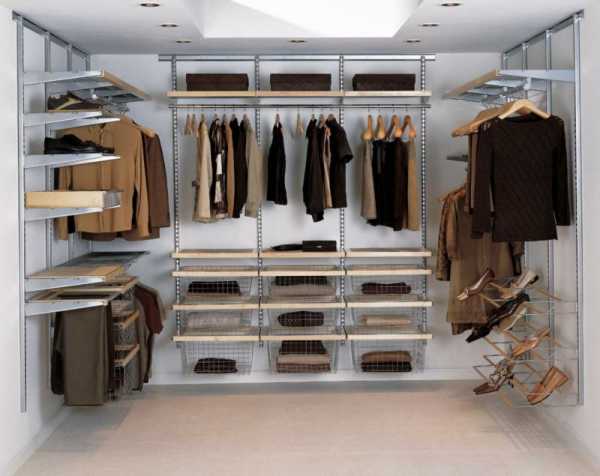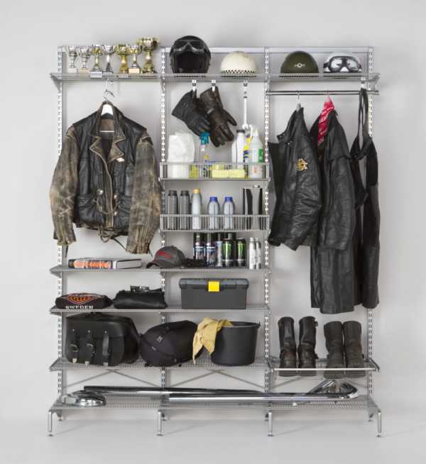 Специализированная «начинка» очень удобна, так как различные полочки, кронштейны и вешала можно размещать и менять местами как угодно. Все эти детали и приспособления легко купить в мебельных магазинах за невысокую стоимость.