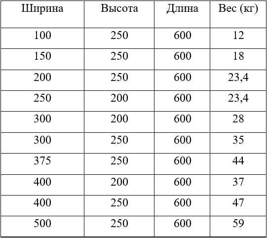 ΠΠ°Π»Π΅Π΅ ΠΌΡ ΡΠ°ΡΡΠΌΠΎΡΡΠΈΠΌ ΡΠ΅ΡΡΡΠ΅ ΡΠ°Π±Π»ΠΈΡΡ, Π² ΠΊΠΎΡΠΎΡΡΡ ΠΏΠΎΠΊΠ°Π·Π°Π½Ρ ΠΏΡΠΈΠΌΠ΅ΡΠ½ΡΠ΅ Π²Π΅ΡΠ° Π³Π°Π·ΠΎΠ±Π»ΠΎΠΊΠΎΠ² ΡΠ°Π·Π»ΠΈΡΠ½ΠΎΠΉ ΠΏΠ»ΠΎΡΠ½ΠΎΡΡΠΈ (D300, D400, D500, D600). Π’Π°ΠΊΠΆΠ΅ ΡΡΠΎΠΈΡ ΠΎΡΠΌΠ΅ΡΠΈΡΡ, ΡΡΠΎ ΡΡΠΈ Π·Π½Π°ΡΠ΅Π½ΠΈΡ ΠΏΠΎΠ΄Ρ ΠΎΠ΄ΡΡ ΠΈΠΌΠ΅Π½Π½ΠΎ Π΄Π»Ρ ΡΡΡ ΠΎΠ³ΠΎ ΡΠΎΡΡΠΎΡΠ½ΠΈΡ Π³Π°Π·ΠΎΠ±Π»ΠΎΠΊΠΎΠ², Π½Π°ΠΌΠΎΠΊΡΠΈΠ΅ Π±Π»ΠΎΠΊΠΈ Π²Π΅ΡΡΡ Π½Π° Π½Π΅ΡΠΊΠΎΠ»ΡΠΊΠΎ ΠΊΠΈΠ»ΠΎΠ³ΡΠ°ΠΌΠΌ Π±ΠΎΠ»ΡΡΠ΅.