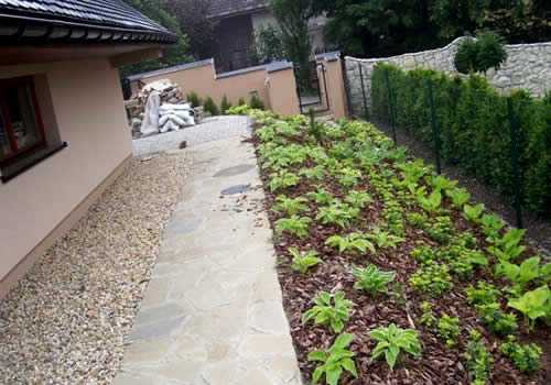 Надземные части растений гравийной отмостки не на много будут больше тех которые на фото, потому нет опасения, что их ветки будут касаться стен дома и приведут к их повреждению. Для гравийной отмостки хорошо подобрать засухоустойчивые кусты, потому что тогда не нужно их слишком часто подливать и влажность вокруг фундаментов будет минимальной.
