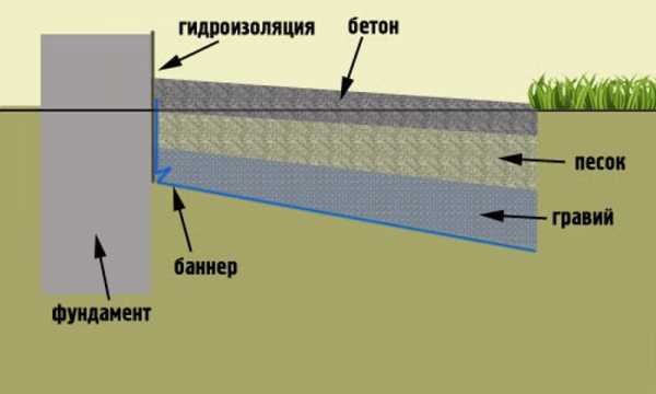 - «Для того чтобы был отвод воды от дома, недостаточно выполнить уклон только верхней конструкции отмостки. Вода, просачиваясь через щебень и песок должна стекать по гидроизоляции, выполненной с уклоном».