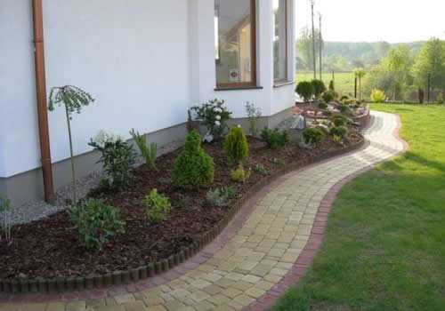 В этом примере обустройства отмостки не стоит заботиться о сохранности фундамента дома из-за растущих корней растений.