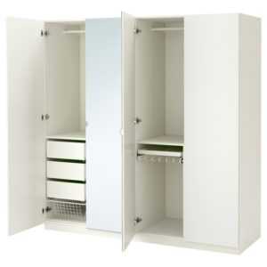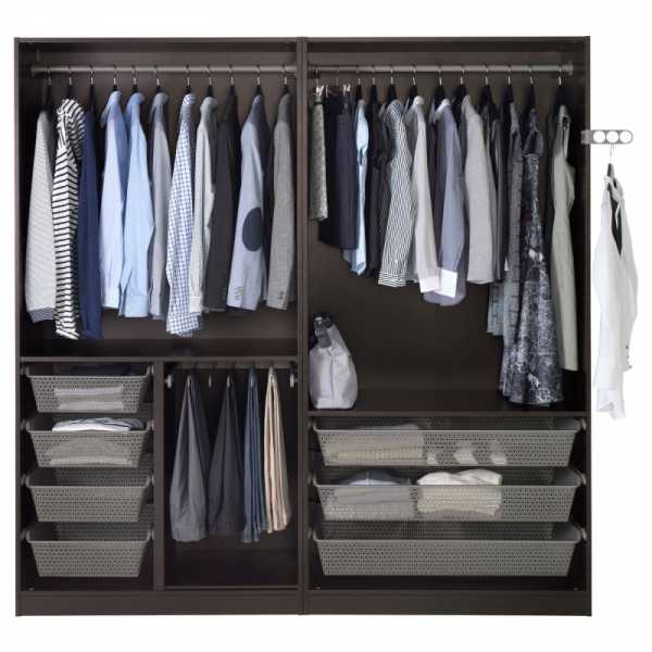 ПАКС гардеробы ИКЕА представлены в большом выборе: от узких конструкций, как «пенал», где всего одна-две полки, одна или две штанги и корзина для нательного белья, до емких хранилищ: пристенных и угловых.