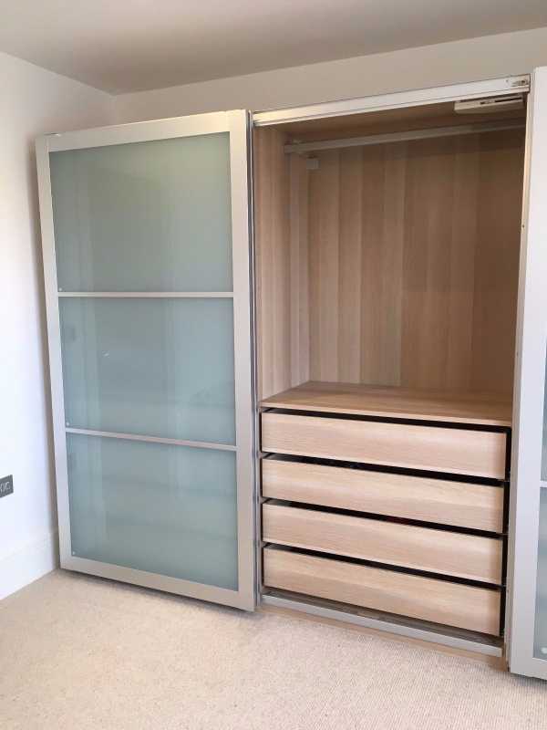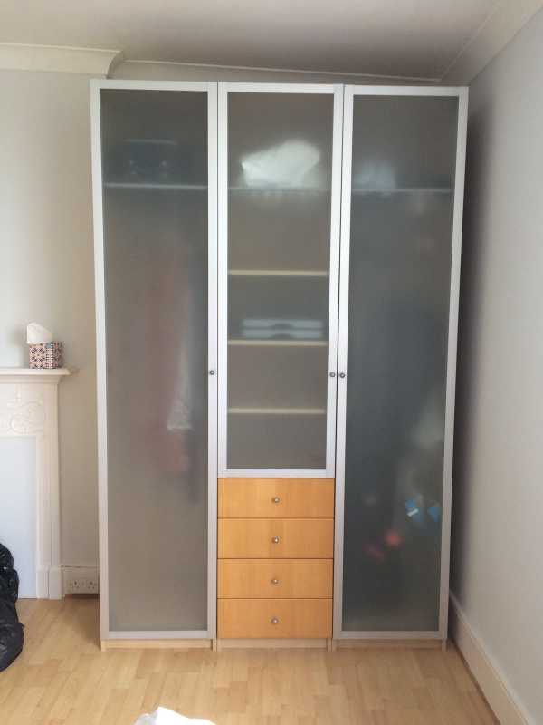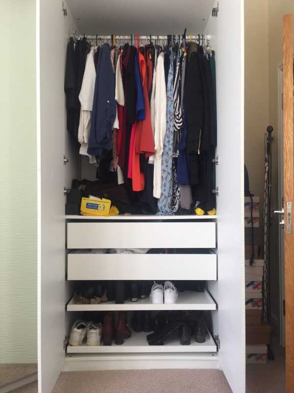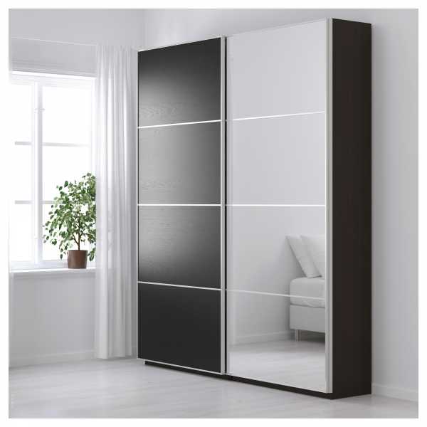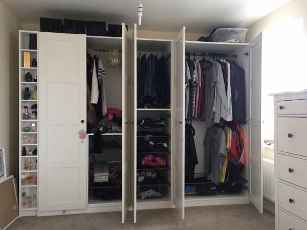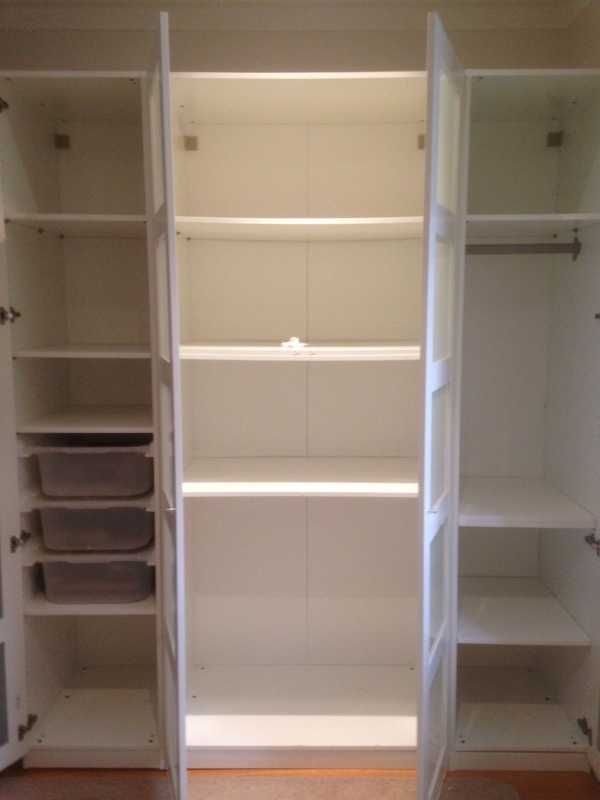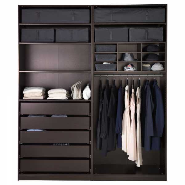 Кстати, узкие шкафы ПАКС — это еще и «продолжение» имеющегося гардероба — комбинация с дверями.Ее привинчивают крепежами к каркасу системы хранения. Удобно продумана дверь, легко устанавливаемая и с левой и с правой стороны модели.