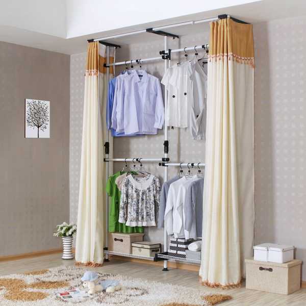 В односекционном шкафу дверца распахивается, но есть вариации с большим количеством отсеков и раздвижными створками. В комплектацию могут входить штанги и полки, для устойчивости мебель рекомендуется фиксировать на стене.