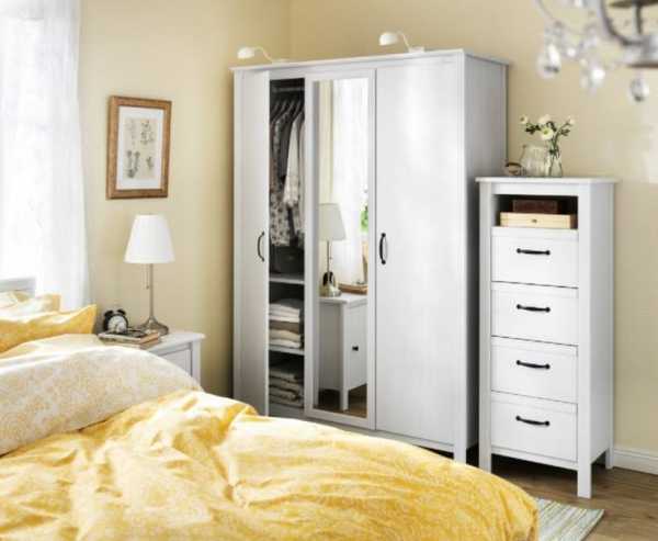 Серия Бримнес от «Икеа» идеально подходит для организации зоны хранения в спальне, но уместна в других помещениях. На фото заметно, что модели выдержаны в скандинавском стиле: светлые фасады освежают интерьер и придают ему легкость, а темная отделка создает акцент на нейтральном фоне.
