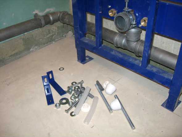 Первый тип представляет собой стальную рамку с различными видами крепления. Унитаз, отводы для канализации и сливная система с бачком крепятся к ней при помощи предусмотренных производителем шпилек.