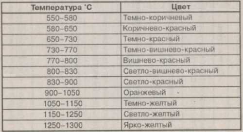 При горячей ковке металла важно знать температурные режимы нагрева. Это поможет более качественно обрабатывать металл. Ковка черного металла выполняется при 800 – 1250 °C. Конечно, измерять градусником раскаленную заготовку будет невозможно и для определения температуры придется ориентироваться по её цвету. В приведенной ниже таблице указаны температуры и цвет заготовки из черных металлов.