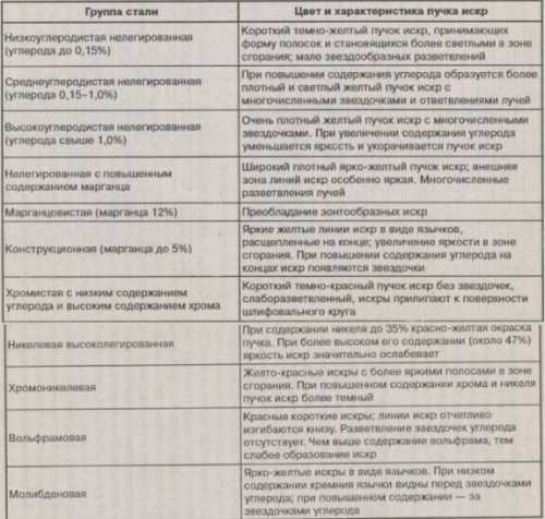 Выбирая тот или иной металл, необходимо использовать Марочник Стали и Сплавов. Но если доступа к нему нет, то можно воспользоваться приведенными ниже таблицами для определения содержания углерода в стали. Сам процесс определения довольно прост, достаточно поднести заготовку к работающему точилу и посмотреть на сноп искр, а затем сравнить его с показателями в таблице.