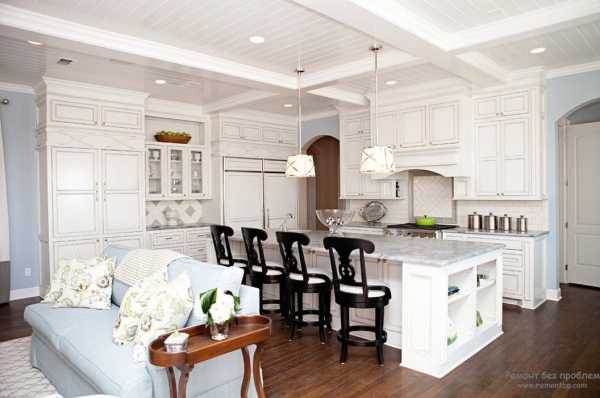 Интересно смотрятся многоуровневые потолки, когда зоны разделяются путем разницы между потолками. Обычно потолок ниже делается в кухонной зоне, под ним часто располагаются конструкции, маскирующие трубы, вытяжку.