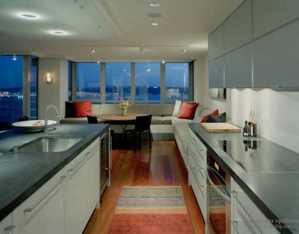 Очень хорошо совмещенный вариант кухни и гостиной подходит для длинных и узких помещений. При этом можно разделить пространство даже на несколько различных зон.
