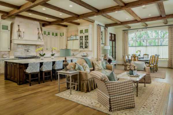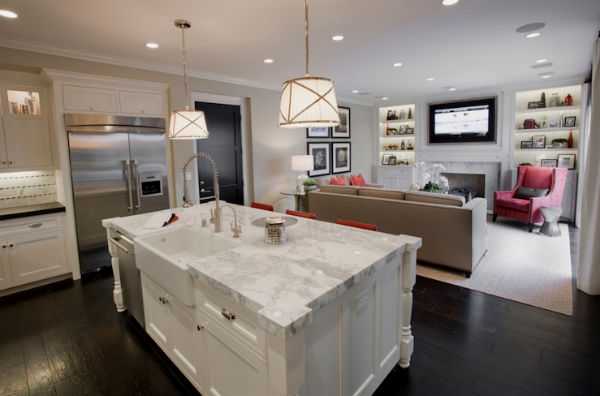 Особенности такого направления в том, что можно находиться как бы одновременно и в кухне, и в гостиной. Приготовив угощения, можно сразу перейти с гостями или семьей в гостиную и удобно расположиться на мягких креслах или диване. Общаясь с гостями или домочадцами, не нужно выходить из комнаты и идти в кухню, чтобы сделать еще чаю или принести еду, теряя при этом нить разговора. Можно сделать всего пару шагов до кухни, продолжая общение. К тому же выглядит этот интерьер очень привлекательно.