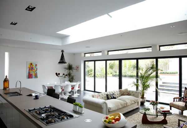 Название данного стиля говорит само за себя, а именно: дизайн гостиной и кухни, объединившихся в одну комнату. Такой интерьер лучше всего подходит для больших помещений, хотя, если жилье таковым не является, то такой прием позволит визуально увеличить пространство. К тому же света становится больше, так как вместо одного окна помещение освещают уже как минимум два.