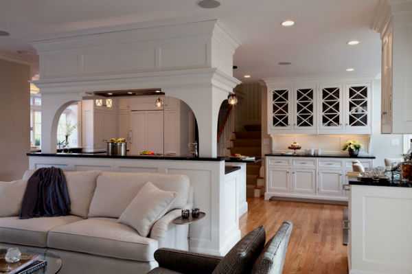 Оформление прохода на границе гостиной и кухни заслуживает серьезного внимания. Его можно выполнить как арку или полуарку, украсить колоннами или асимметричной декоративной конструкцией.