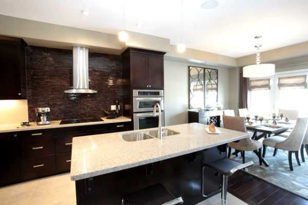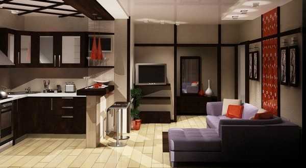 Шоколадный цвет в интерьере гостиной с совмещенной кухней