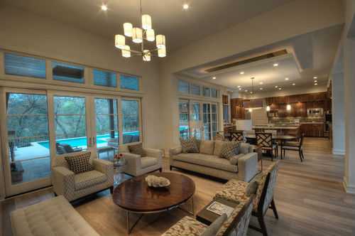 - Удобно проводить семейные встречи, вечеринки с друзьями в таком большом и помещении, где удобно подавать прохладительные напитки и закуски из обеденной зоны в гостиную. Хозяйка может готовить еду, беспрепятственно общаясь с гостями или наблюдая за детьми.