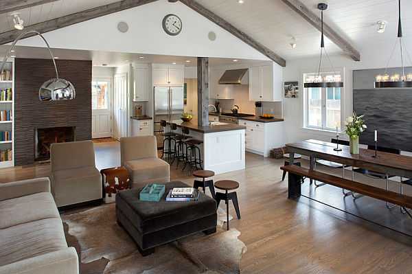 К этому варианту также прибегают владельцы небольших загородных домов. Очень эффектно и современно смотрится такой интерьер в частном доме. Существует множество идей дизайна интерьера гостиной, совмещенной с кухней. Они предлагают разнообразные цветовые решения, варианты зонирования и расположения мебели. Рассмотрим их ниже.