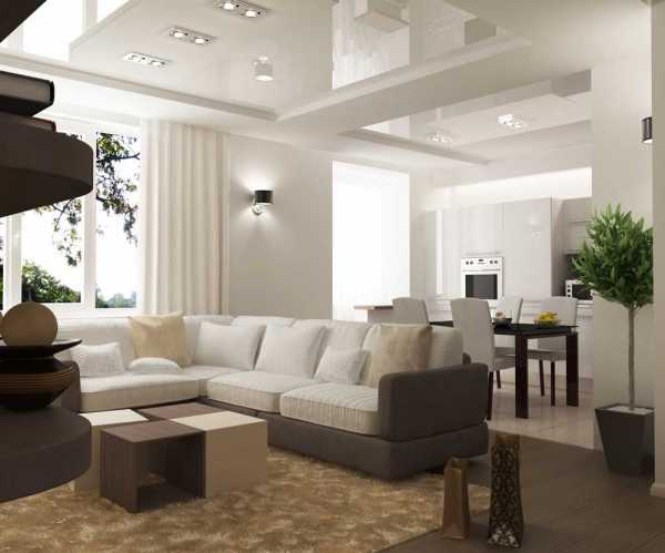 Белый цвет в интерьере гостиной с совмещенной кухней