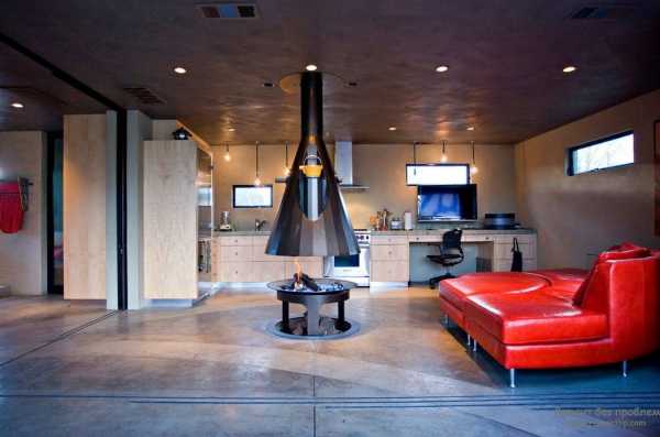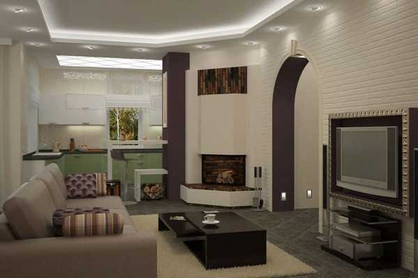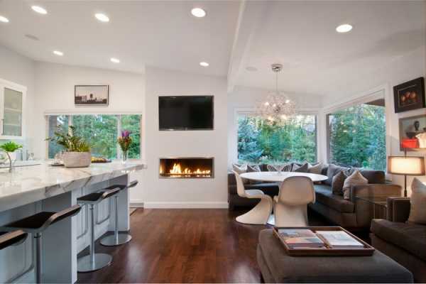 Также очень гармонично впишется в интерьер гостиной, совмещенной с кухней, общий камин.