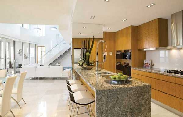 Объединение двух разных по целевому назначению помещений актуально не только для тесных «хрущевок». В загородных резиденциях и роскошных квартирах идея создать открытый объем в общественной части интерьера не менее притягательна.