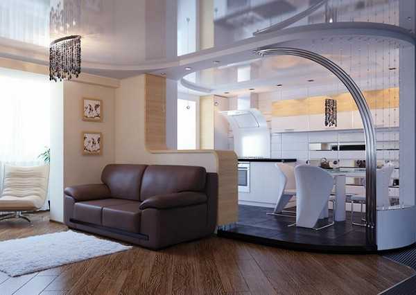 Для усиления эффекта зонирования можно использовать разные отделочные материалы для потолка. У них могут быть разные фактура, цвет, лепнина и т. д. Если у Вас невысокий потолок, используйте зеркала для визуального увеличения пространства. Очень многие отдают предпочтение перегородкам между кухней и гостиной. Это могут быть шторы, создающие уют в помещении. Используют также ширмы, деревянные полотна, жалюзи.