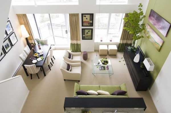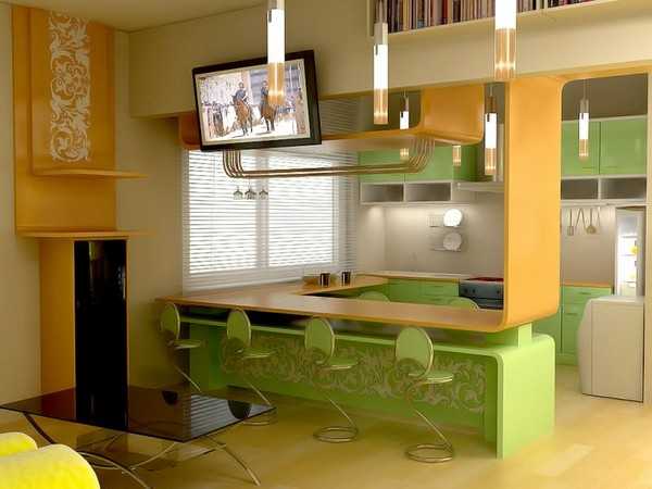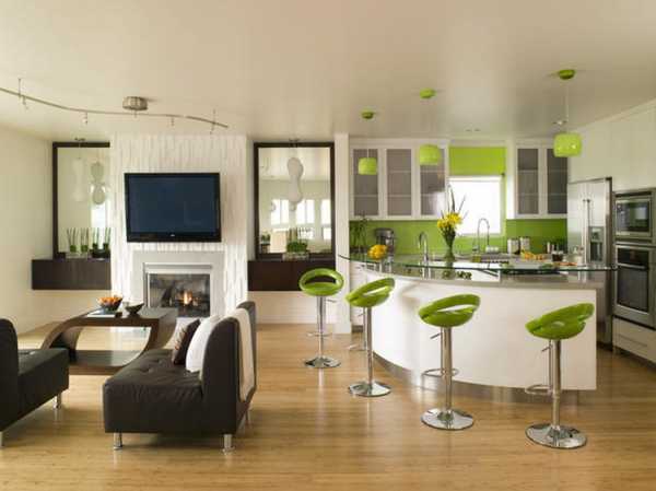 Зеленый цвет в интерьере гостиной с совмещенной кухней