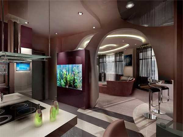 Шоколадный цвет в интерьере гостиной с совмещенной кухнейАрочные проемы