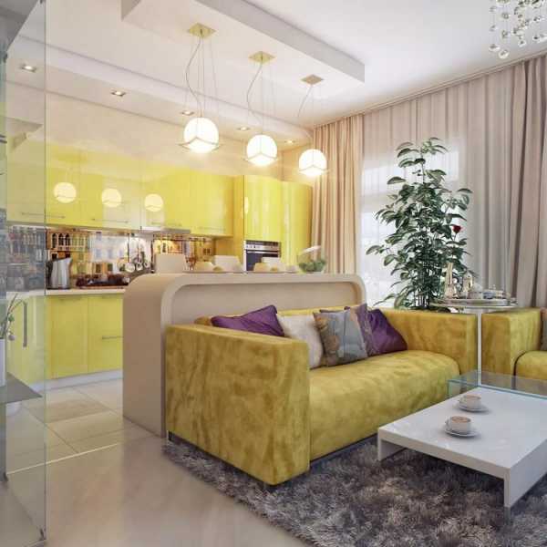 Желтый цвет в интерьере гостиной с совмещенной кухней