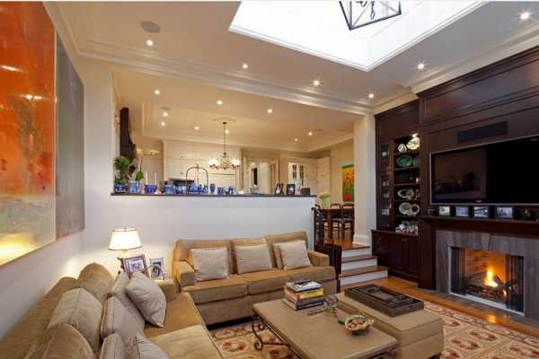 Рациональное решение для гостиной: точечное потолочное освещение по периметру в комбинации с локальными светильниками (бра, торшерами, настольными лампами). Важно добиться компромисса между мягкими и яркими световыми переходами.