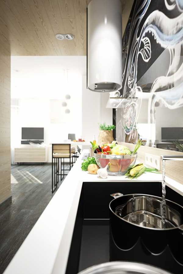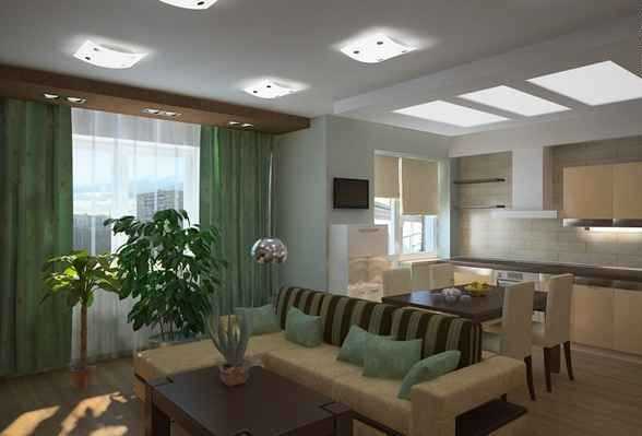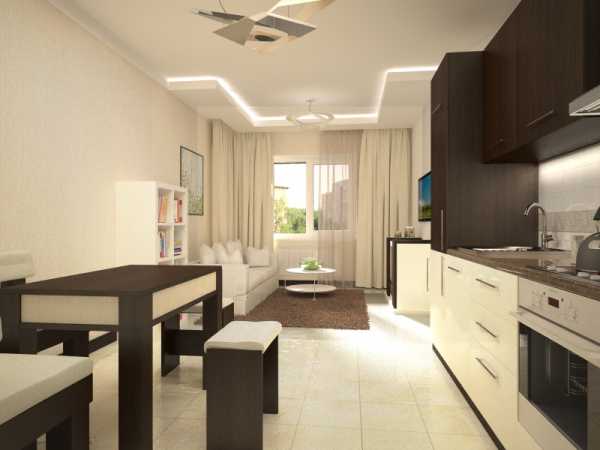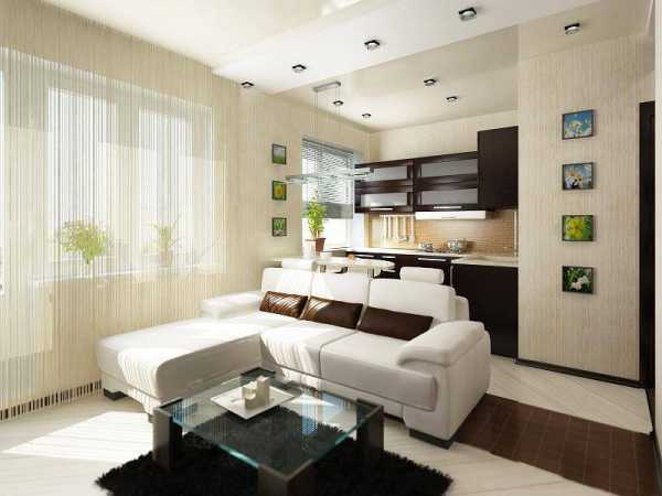 В квартире таких размеров главное — целостность. Здесь не так много дверей, и это плюс, поэтому в таком помещение уделяем внимание цветовому сочетанию и расстановке мебели. Для начала определяем, где будет находиться гардеробная, для нее нужны двери-купе. Если требуются перегородки, берем стеклянные, также используем зеркала, особенно напротив источников света. Зонировать комнату можно и тканевыми занавесками. Если вы хотите использовать гипсокартонные конструкции, сделайте их ажурными, встройте в них освещение, полки оставьте открытыми.Обычно в маленьких квартирах кухни также небольшие. Кухонный гарнитур распределяем по 2-м стенам, а подоконник подбираем под столешницу. Духовой шкаф размещаем на уровне глаз, над ним микроволновку, а внизу можно отлично разместить две машинки — стиральную и посудомоечную. Если это позволит планировка, санузел лучше сделать совмещенным. Вместо ванны купите душевую кабинку.