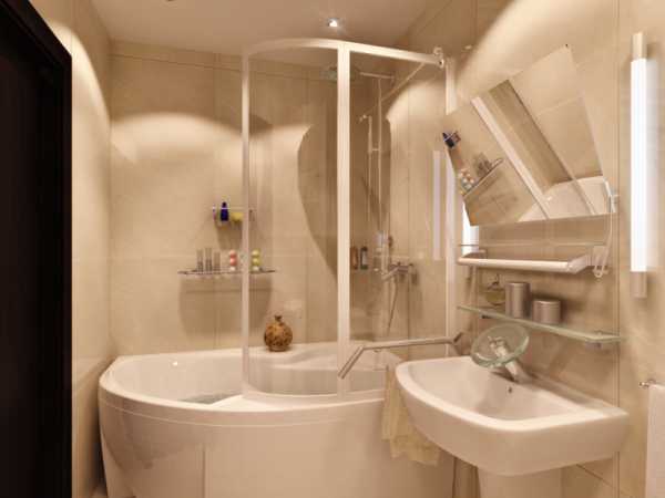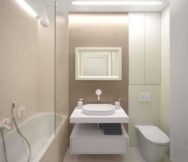 Не забываем о светлых тонах отделки. Плитка может быть средних или малых размеров. Выигрышным вариантом в оформлении маленькой ванной комнаты станут зеркальные поверхности и глянцевые натяжные потолки.