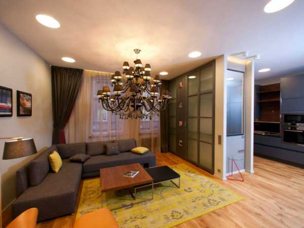 Зонировать небольшую квартиру нужно правильно. Вместо перегородок для зонирования можно воспользоваться отделочными материалами, например, пол кухни и прихожей отделать плиткой, гостевую зону ламинатом ), спальную зону обозначают небольшим ковриком. Помещение также можно разделить на зоны и освещением. Как же это будет смотреться? Это можно увидеть на фото интерьера однокомнатной квартиры.