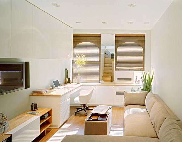А если вы любите работать дома, то в этой же нише с успехом можно разметить домашний кабинет. Но только для этого придется в ней соорудить второй этаж. На втором этаже можно разместить кровать а внизу кабинет, или наоборот. Таким образом получится вполне функциональное пространство умещающее в себе аж целых две зоны.