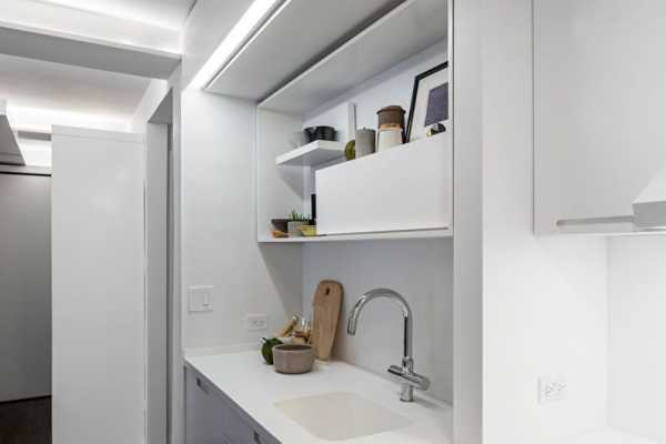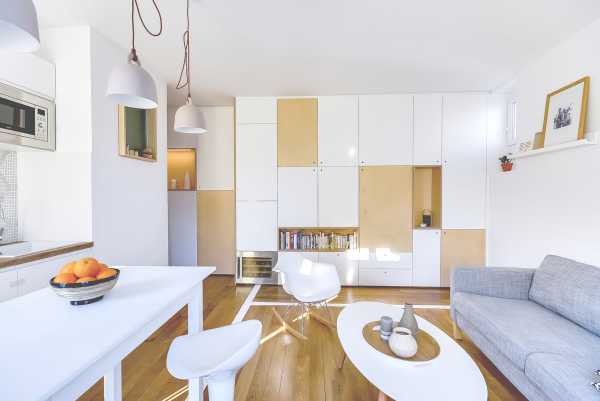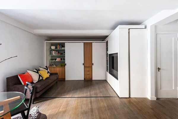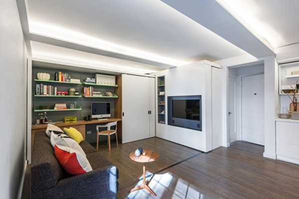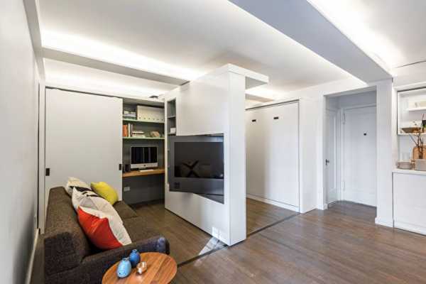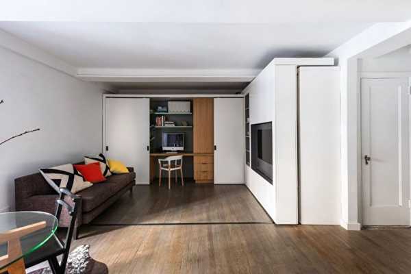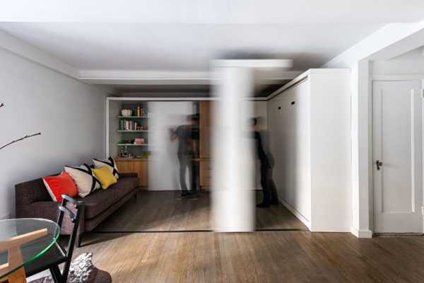 Эта квартира-трансформер способна меняться в зависимости от потребностей ее обитателей. К примеру, в ночное время здесь есть кровать, которая чудесным образом прячется в стену, открывая полноценный гардероб. Но если сдвинуть стену, а также развернуть телевизор, то получается гостиная и удобный рабочий кабинет.