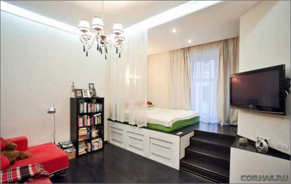 В дополнение к этому, с целью улучшения интерьера и зонирования однокомнатной квартиры, для спальной зоны можно дополнительно соорудить подиум. Это так же может повысить эргономику комнаты, если в свободном пространстве — в подиуме, соорудить выдвижные ящики. Туда можно будет складывать те же постельные принадлежности или другие вещи и различные мелочи, которые всегда с избытком присутствуют в каждом доме.