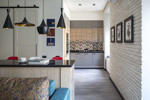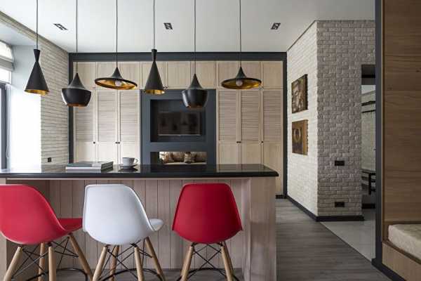 Практически вся мебель сделана на заказ, подстраиваясь под особенности интерьера. Стол решили заменить барной стойкой, которая отделяет жилое пространство от кухни. Разная отделка стен делает дизайн квартиры более разнообразным и сложным.